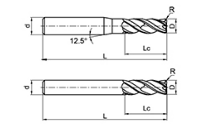 | Nej. | Diameter D | R Vinkel R | Fløjte Længde Lc | Samlet længde L | Shank Dia d | Klingetælling F |
