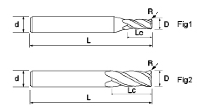 | Nej. | Diameter D | R Vinkel R | Fløjte Længde Lc | Samlet længde L | Shank Dia d | Klingetælling F |
