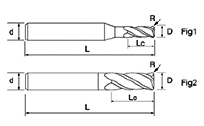 | Nej. | Diameter D | R Vinkel R | Fløjte Længde Lc | Samlet længde L | Shank Dia d | Klingetælling F |