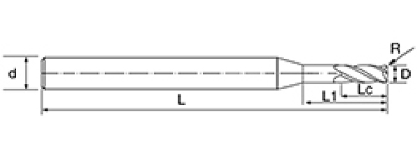| Nej. | Diameter D | R Vinkel R | Fløjte Længde Lc | Effektiv længde L1 | Samlet længde L | Shank Dia d | Klingetælling F |