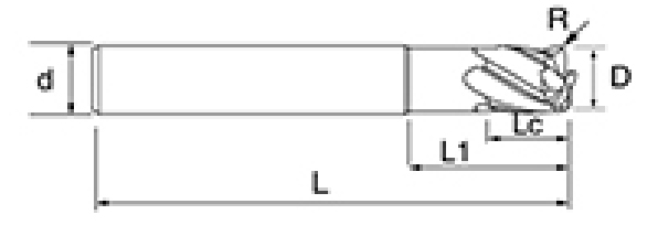 | Nej. | Diameter D | R Vinkel R | Fløjte Længde Lc | Effektiv længde L1 | Samlet længde L | Shank Dia d | Klingetælling F |