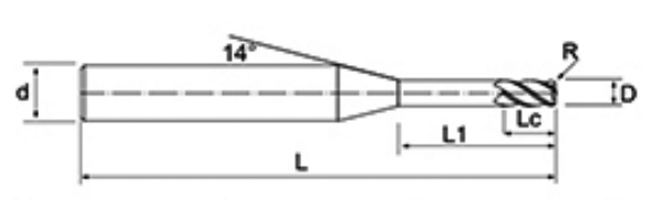 | Nej. | Diameter D | R Vinkel R | Fløjte Længde Lc | Effektiv længde L1 | Samlet længde L | Shank Dia d | Klingetælling F |