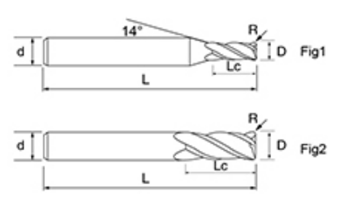 | Nej. | Diameter D | R Vinkel R | Fløjte Længde Lc | Samlet længde L | Shank Dia d | Klingetælling F |